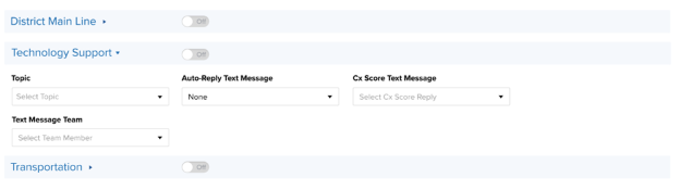 Manage text settings for each phone number associated with your account. Select a Topic, Auto-Reply Message, and Cx Score Text Message, and identify your Text Message Team.