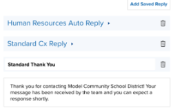 Create and manage saved replies for tickets, Cx Messages, or Auto-Reply Messages. Add a Saved Reply by selecting “Add Saved Reply.” Edit the name and message for each Saved Reply.