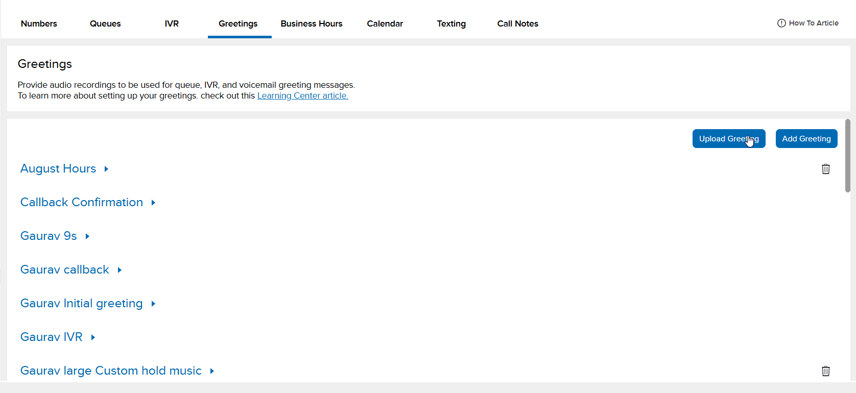 Click on "Add Greeting" to upload audio files for greetings. Each greeting requires a name and accepts mp3 and wav files.