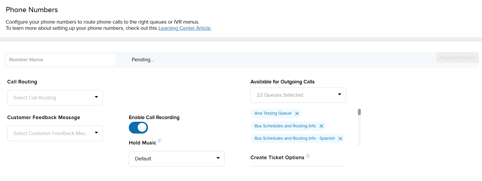 For accounts that have never requested a number before - You’ll click the Request Number button. This will submit your request to our team, and the request will show as Pending until it is processed.
