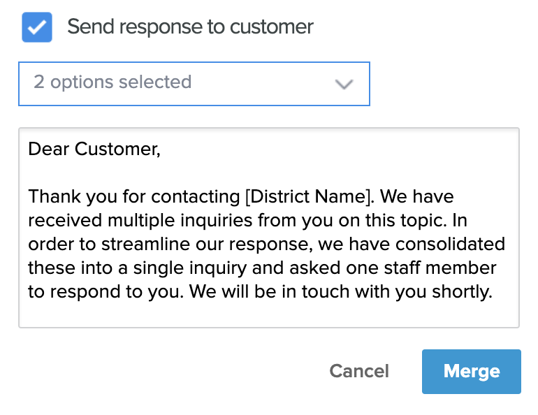 - Check the Send Response to customer checkbox if you want to send a notification to the customer letting them know their tickets have been merged. If the ticket you are merging is from different customers, then select the customer who will receive the message. Onflo (formerly Let's Talk) will automatically populate the message below, but you can customize it as needed.