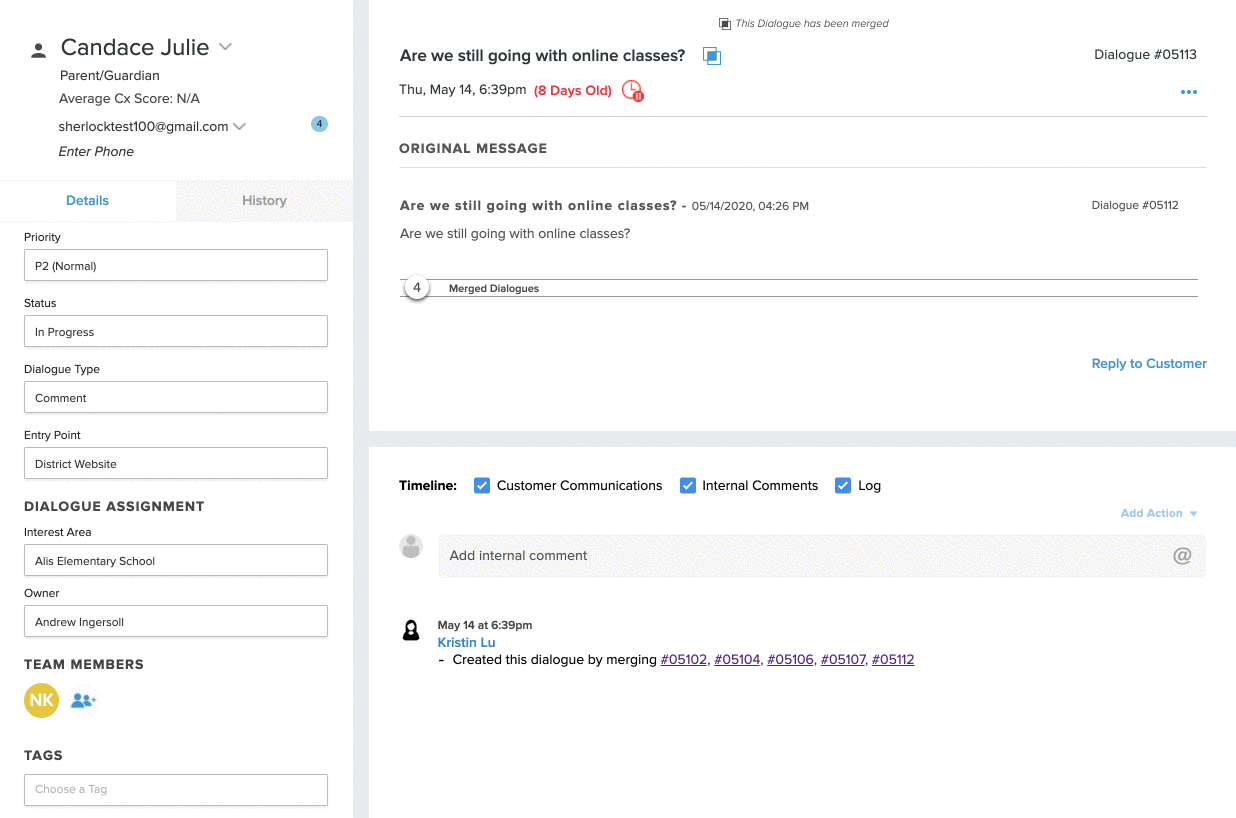 When someone in your community sends in multiple tickets regarding the same issue, perhaps even across multiple Topics, rather than closing them out one at a time with the same response, combine them into one ticket and proceed from that!