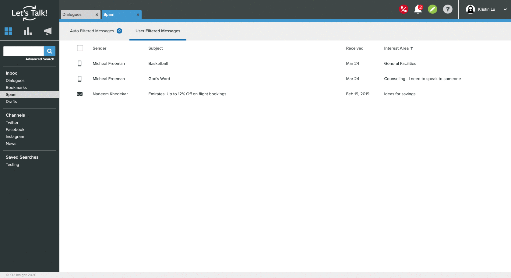 • Your spam is separated into Auto-Filtered Messages (tickets from emails marked as spam)  and User Filter Messages (tickets that are manually marked as spam by users)