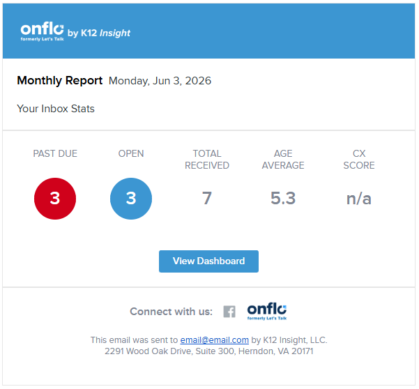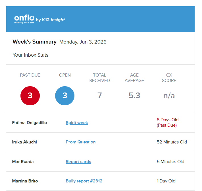 - Shows a snapshot of key data from your Onflo (formerly Let's Talk) Dashboard. You’ll always stay on top of your key statistics, and know how you stack up in your district.