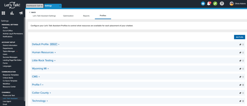 From the Settings page, click on Chatbot listed under the Channels section. You will see a Default Profile which lists all of the resources available.