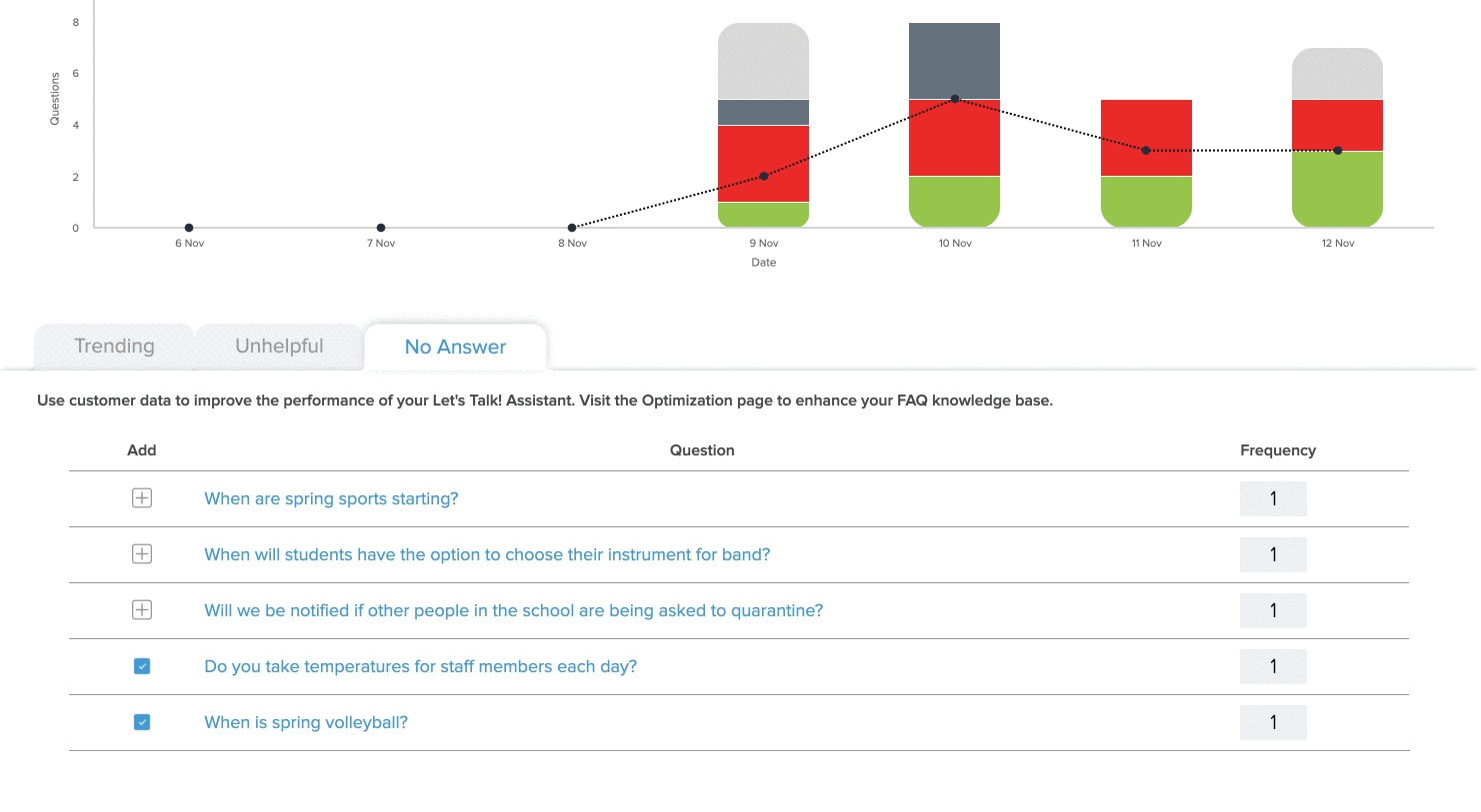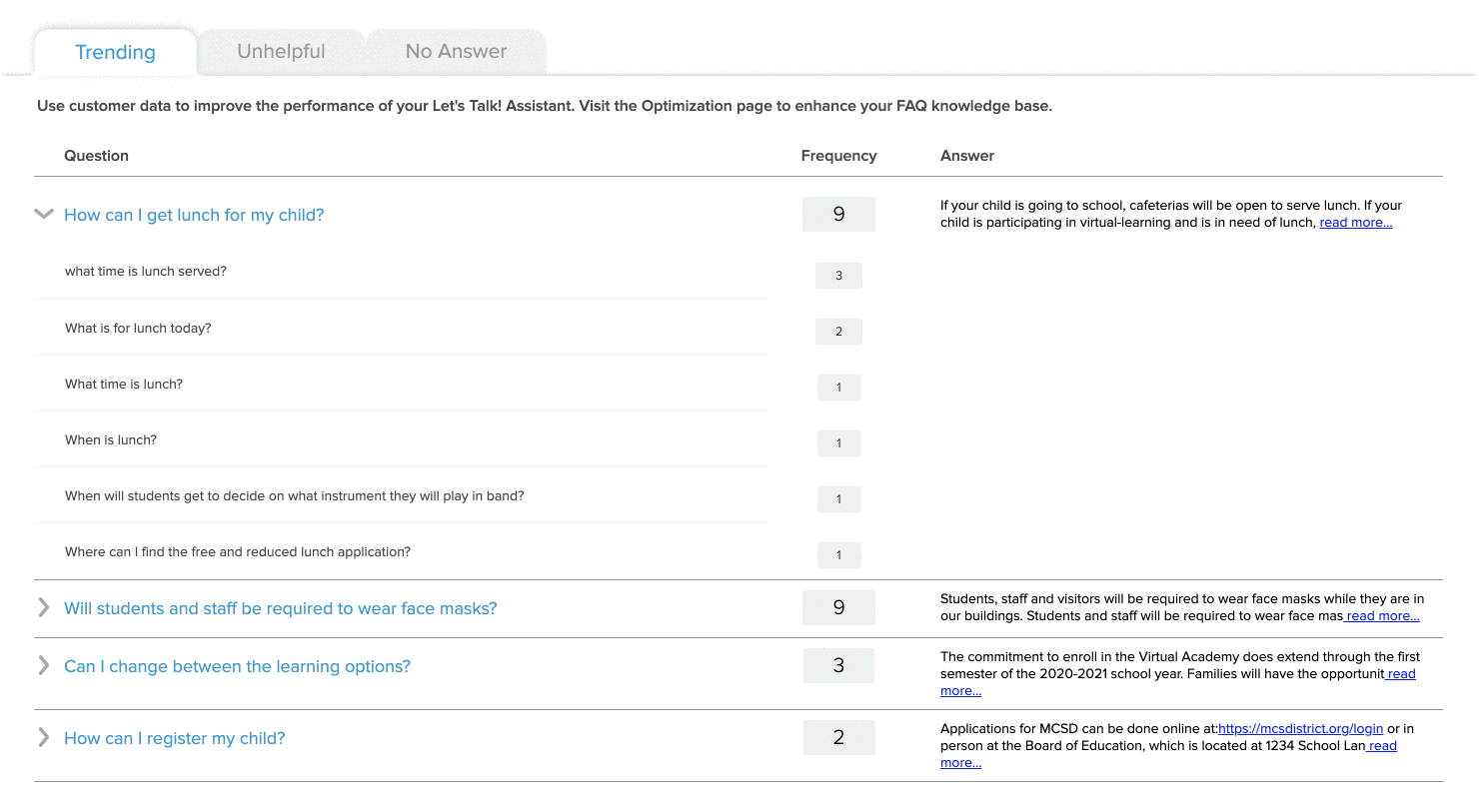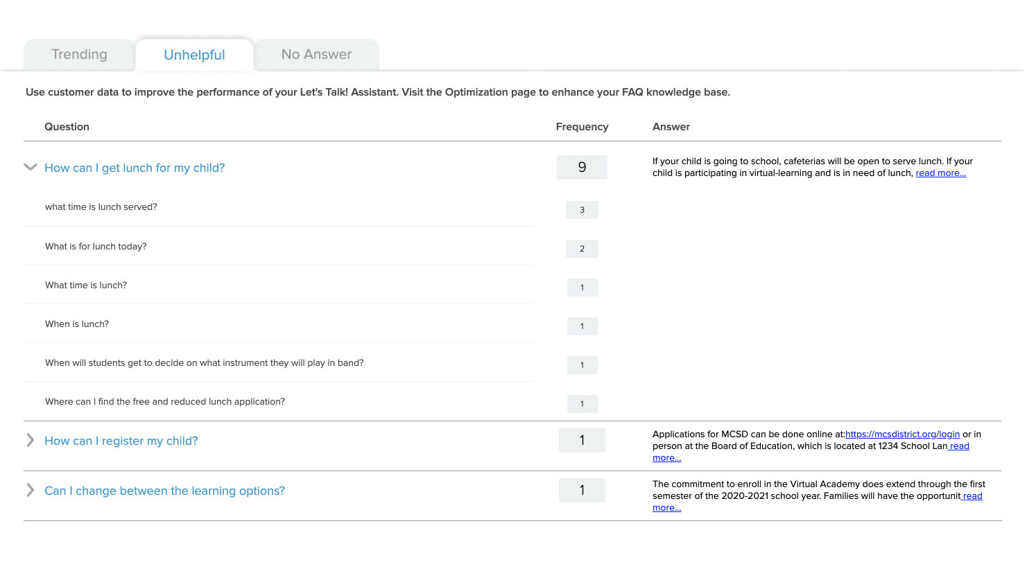 At the bottom of the report you will find three tabs that bucket questions into three groups: Trending, Unhelpful, and No Answer. Your district can leverage these tabs to enhance your knowledge base and outreach efforts by reviewing frequent inquiries, revising FAQs that are being misunderstood or not answering a question, and adding questions that have not been addressed within the FAQs at all.