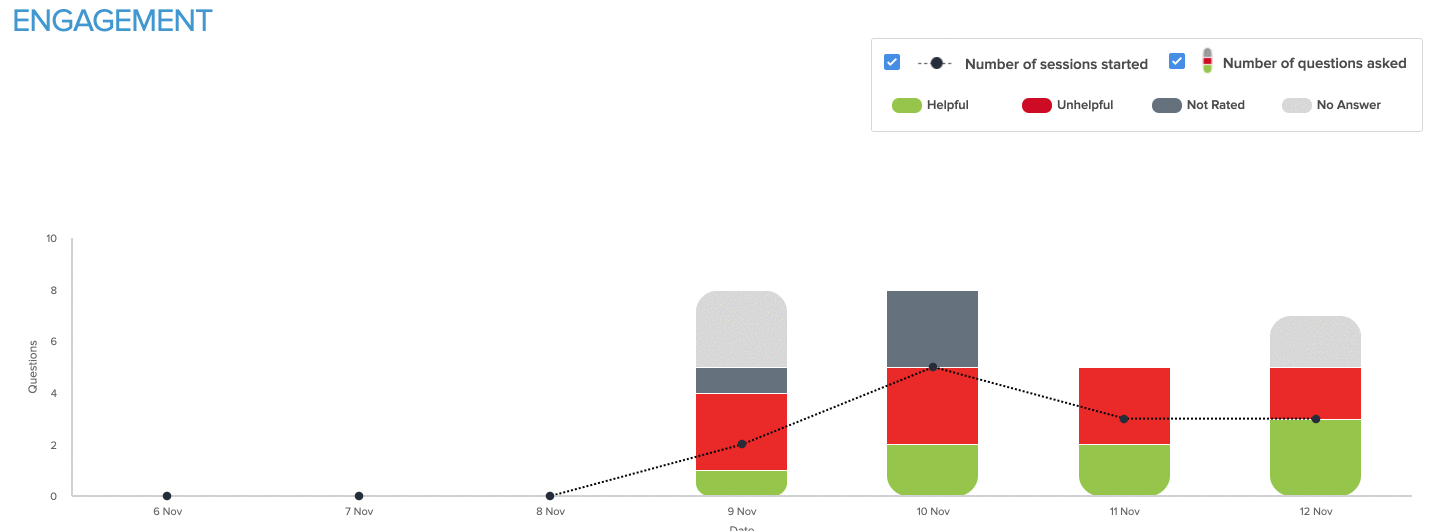 The Engagement section of the report is a graph that showcases the usage of the chatbot across time. The legend at the top right shows you the breakdown of the questions coming into chatbot for that period of time on the graph.