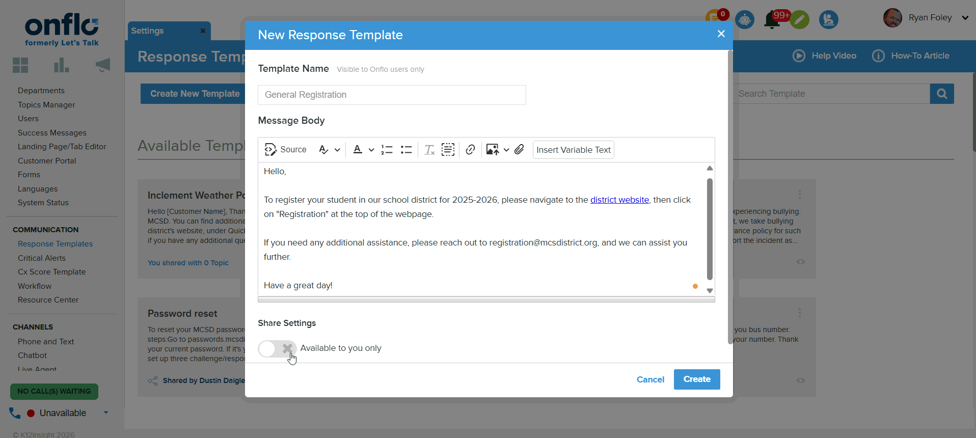 Response Templates are customizable saved messages that Onflo (formerly Let's Talk!) Users can access when replying to Customers. System Administrators and Topic Owners can create an unlimited number of standard replies, as well as choose who can access each Template.