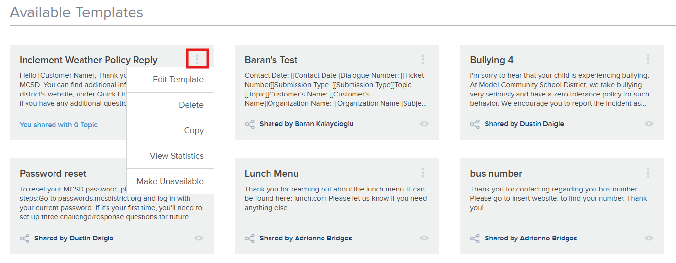 - When you share a Template with a given Topic, the Topic owner is notified via email about gaining access to your Response Template. You can include an email message under Share Settings.
