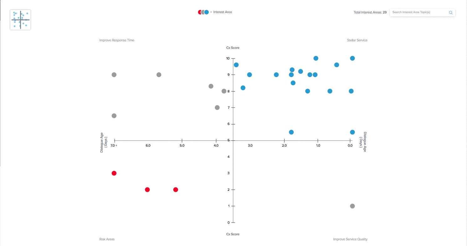 - Bottom-left: Risk Areas. These dots require the most focus as they are both slower in responding as well as receiving low scores from customers.