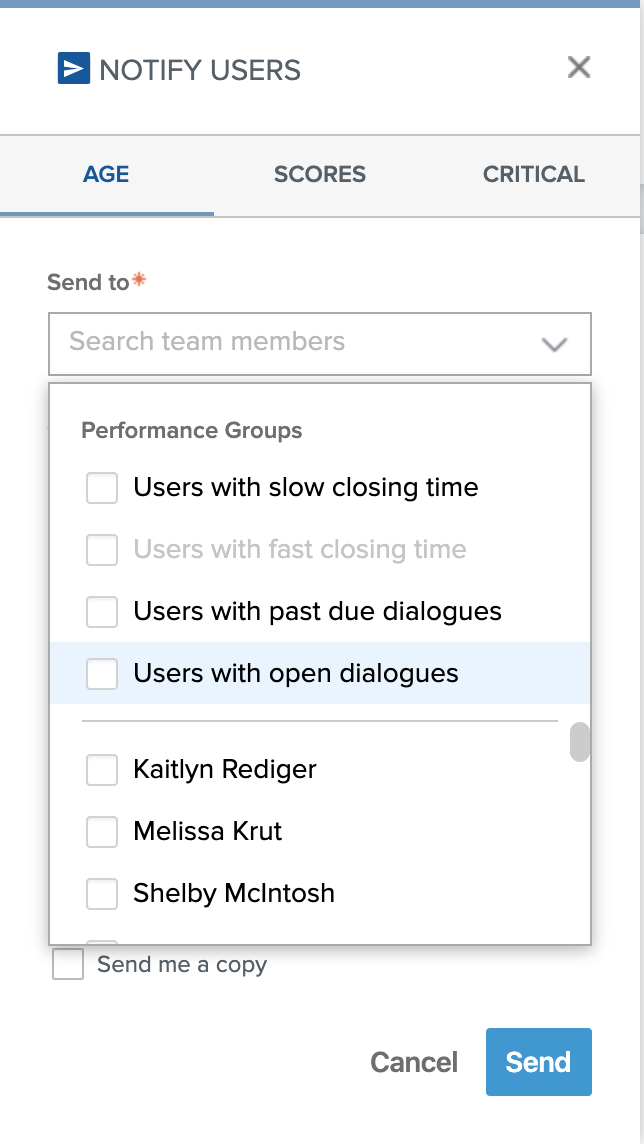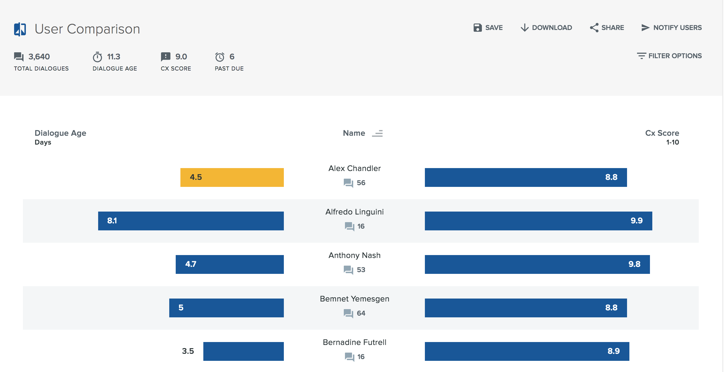 - The comparison report allows you to send notifications to your users for a number of reasons - such as reminding them about past due tickets or cheering them on for receiving positive Cx scores.