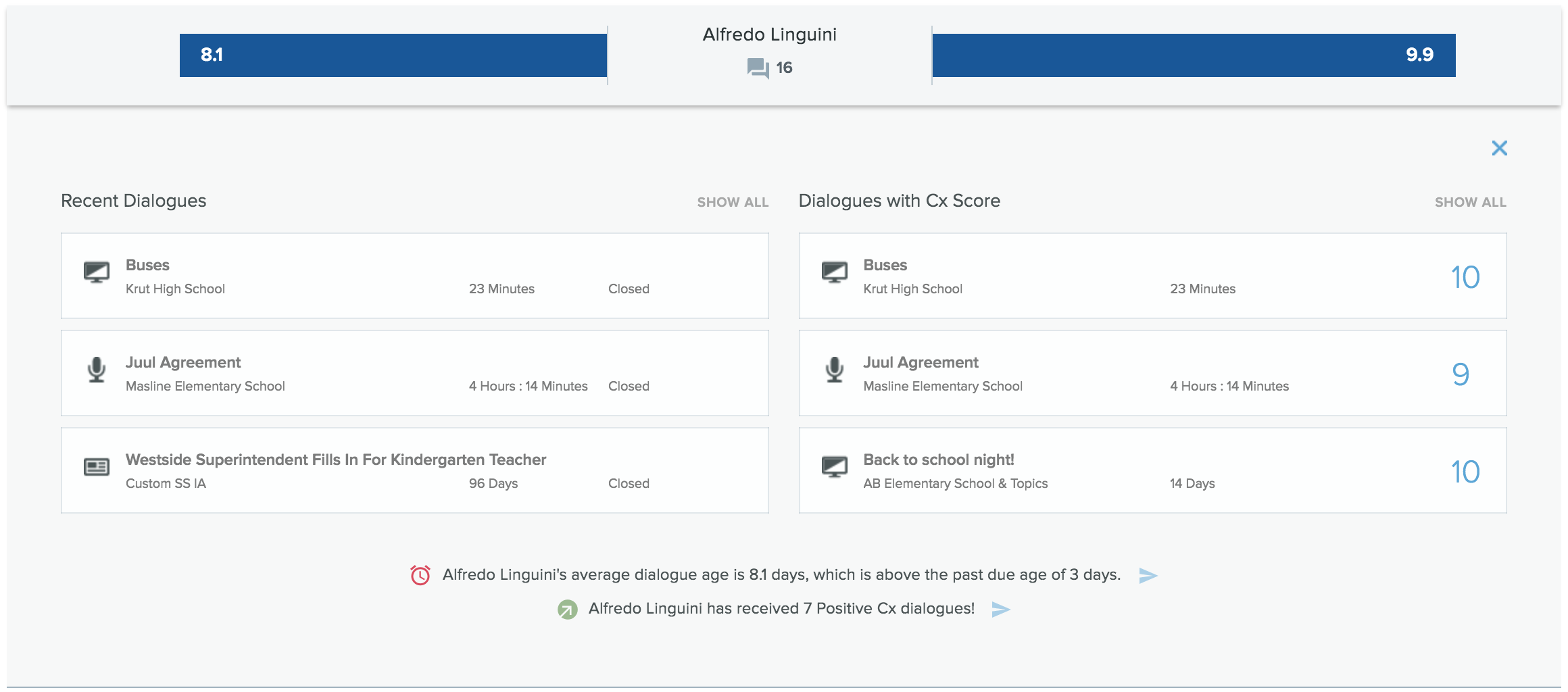 - On the left side, you will see the top 3 recent tickets that received Cx Scores which appear in the recency of the ticket received to date.