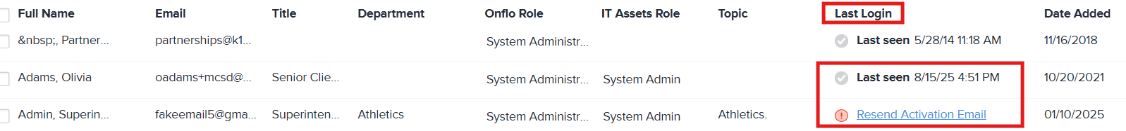 The filter will show only users who are either inactive or unverified, as designated by the red exclamation mark or gray check mark in the Last Login column.