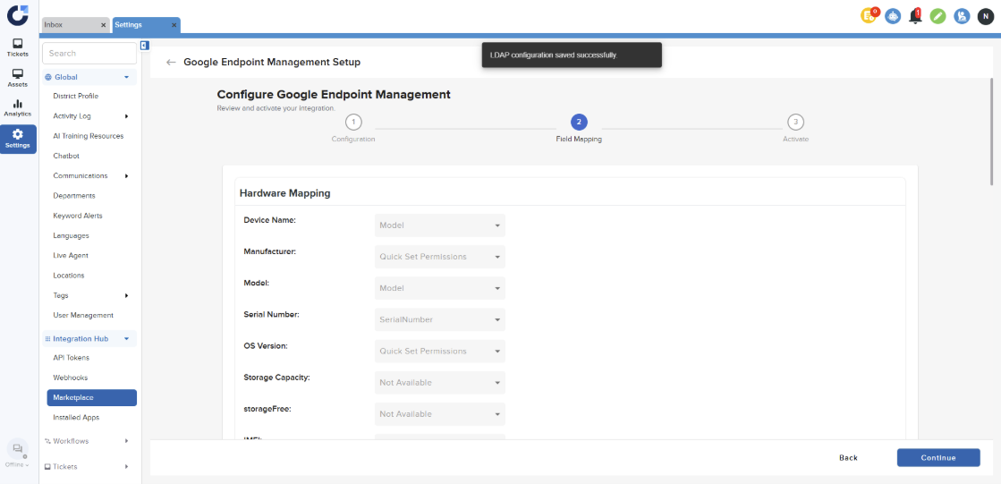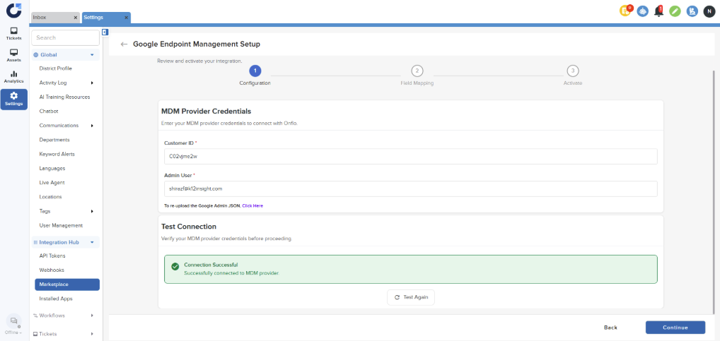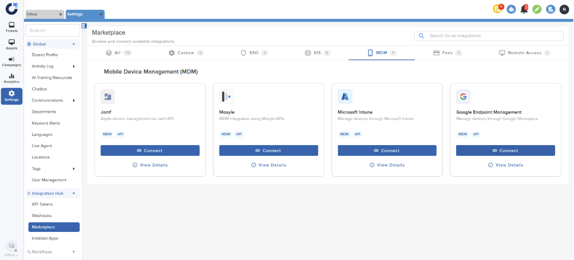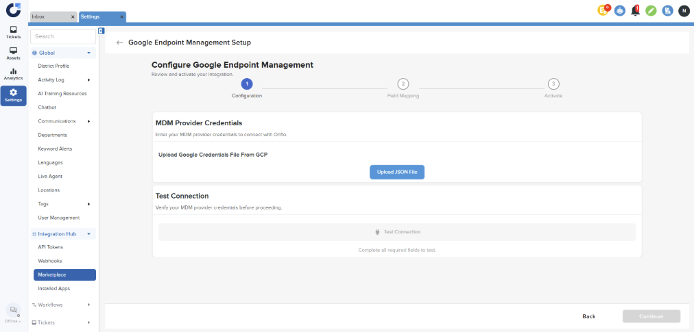 Step 1: Click on Connect on the Google Endpoint Management application in the MDM section of the Integration Marketplace.