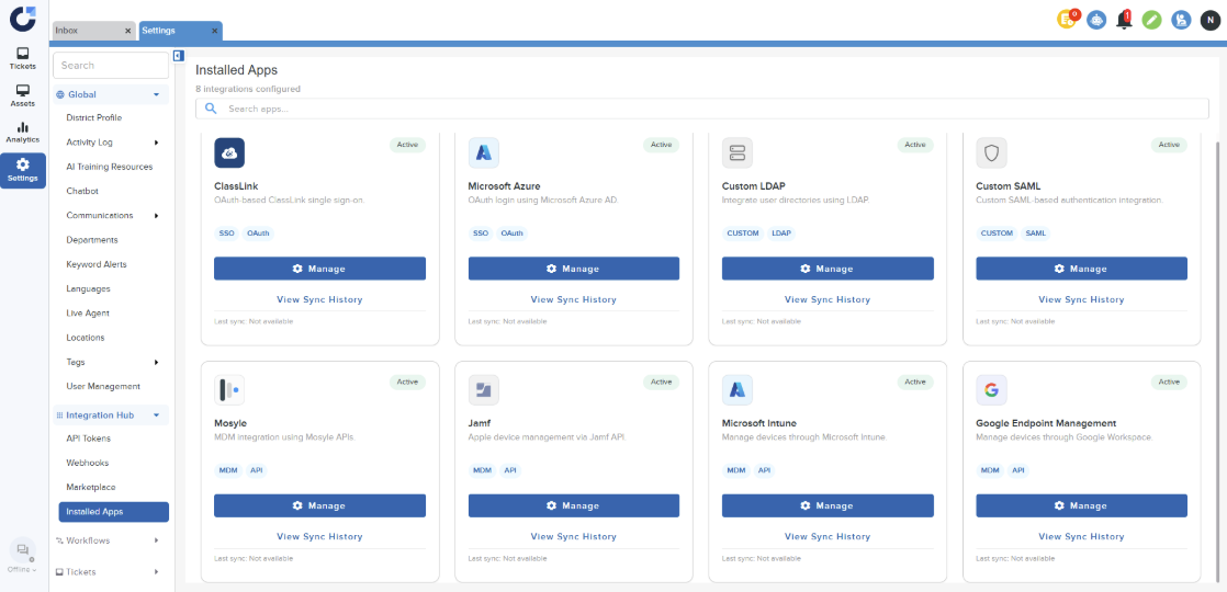 Step 5: Once the application is installed it will be shown in the Installed Apps section of the Integration Hub.