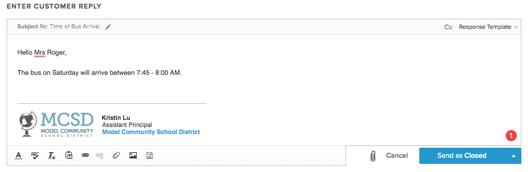 Close a ticket when replying to the customer by selecting Send as Closed.