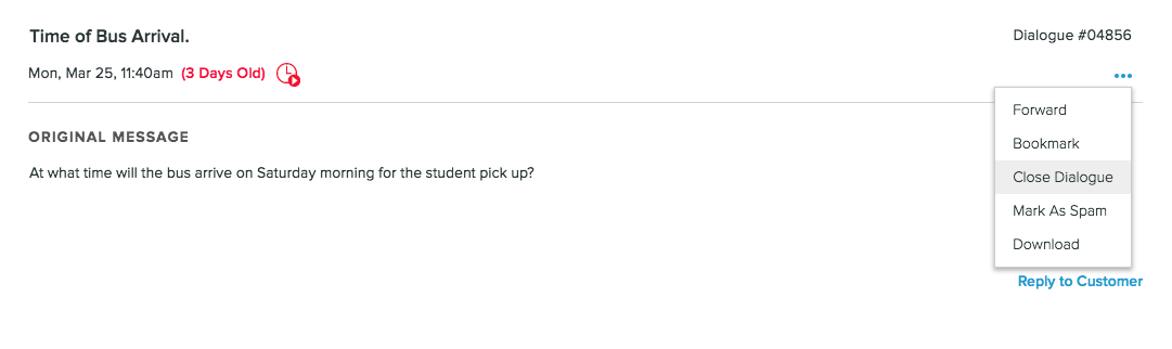 - Tickets for which no Reply button is displayed must still be closed. For example, if a Customer has provided a phone number and no email address, the returned phone call can be logged as an Action Taken in Internal Comments and the Ticket can be closed.