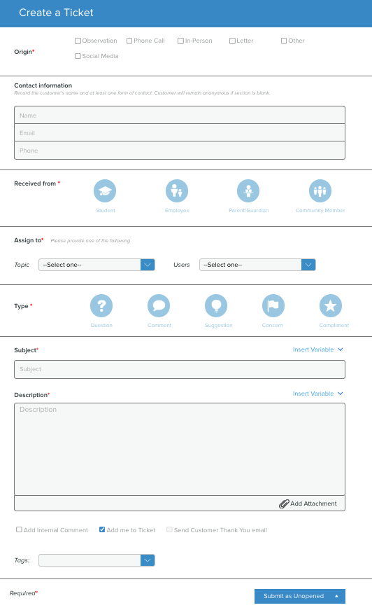 The Create a Ticket form that opens includes most of the same fields as the Customer-facing version, with a few variations.