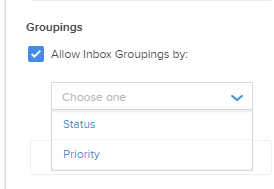 To enable Inbox Groupings, click on the “Fields” drop-down menu located at the top right of the Inbox. Click on the checkbox labeled “Allow Inbox Groupings by:”, then select either the “Status” or “Priority” option.