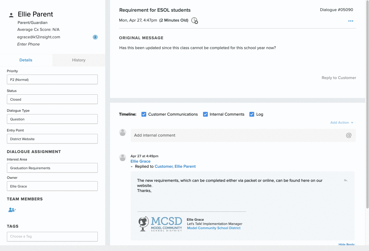 Use Case 2: The Athletic Director needs help from a coach to answer a question that was received from a parent. The coach is not a User. Forward the Ticket to the coach and she can respond to the Athletic Director with the necessary information to discuss with the parent.