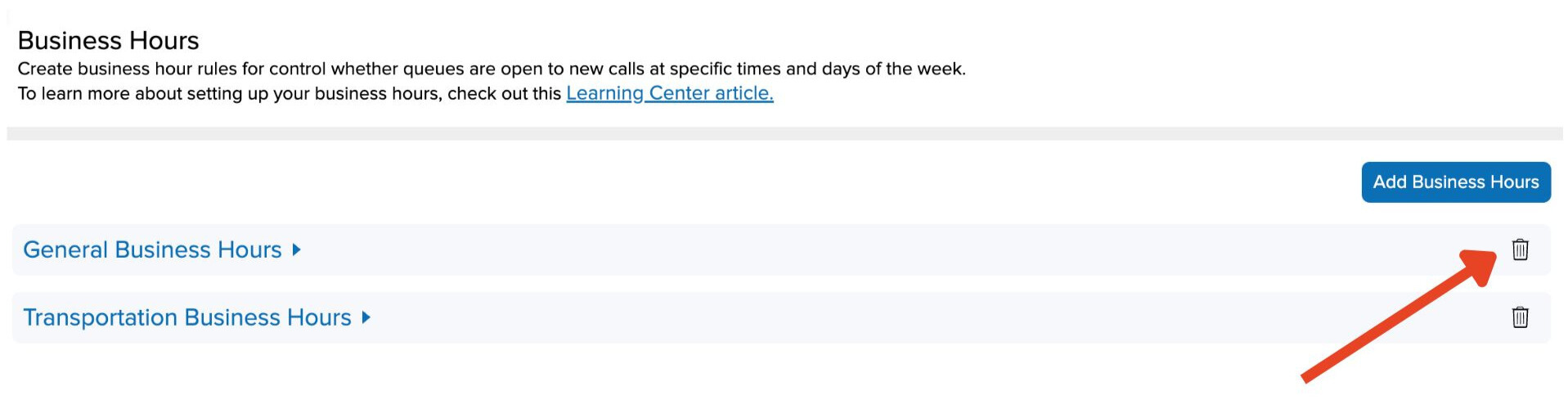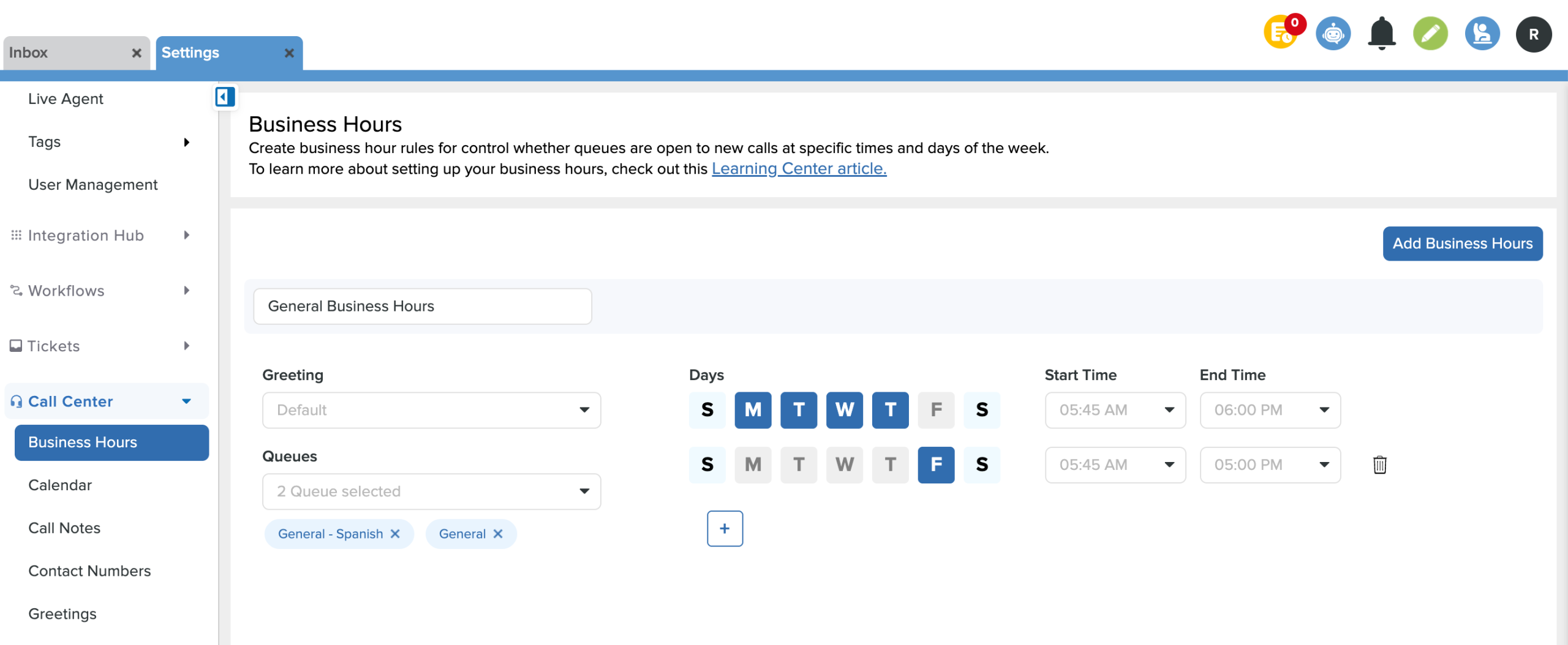 - From Settings, scroll down to Call Center and click on Business Hours.