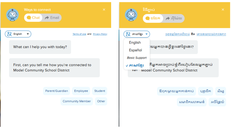 Offer the convenience of Onflo (formerly Let's Talk!) Chatbot to more of your community by enabling Spanish in Settings > Chatbot. Once enabled by a System Administrator, customers will have the option to interact with multiple language options available in Onflo Chatbot via the embedded Onflo Tab.