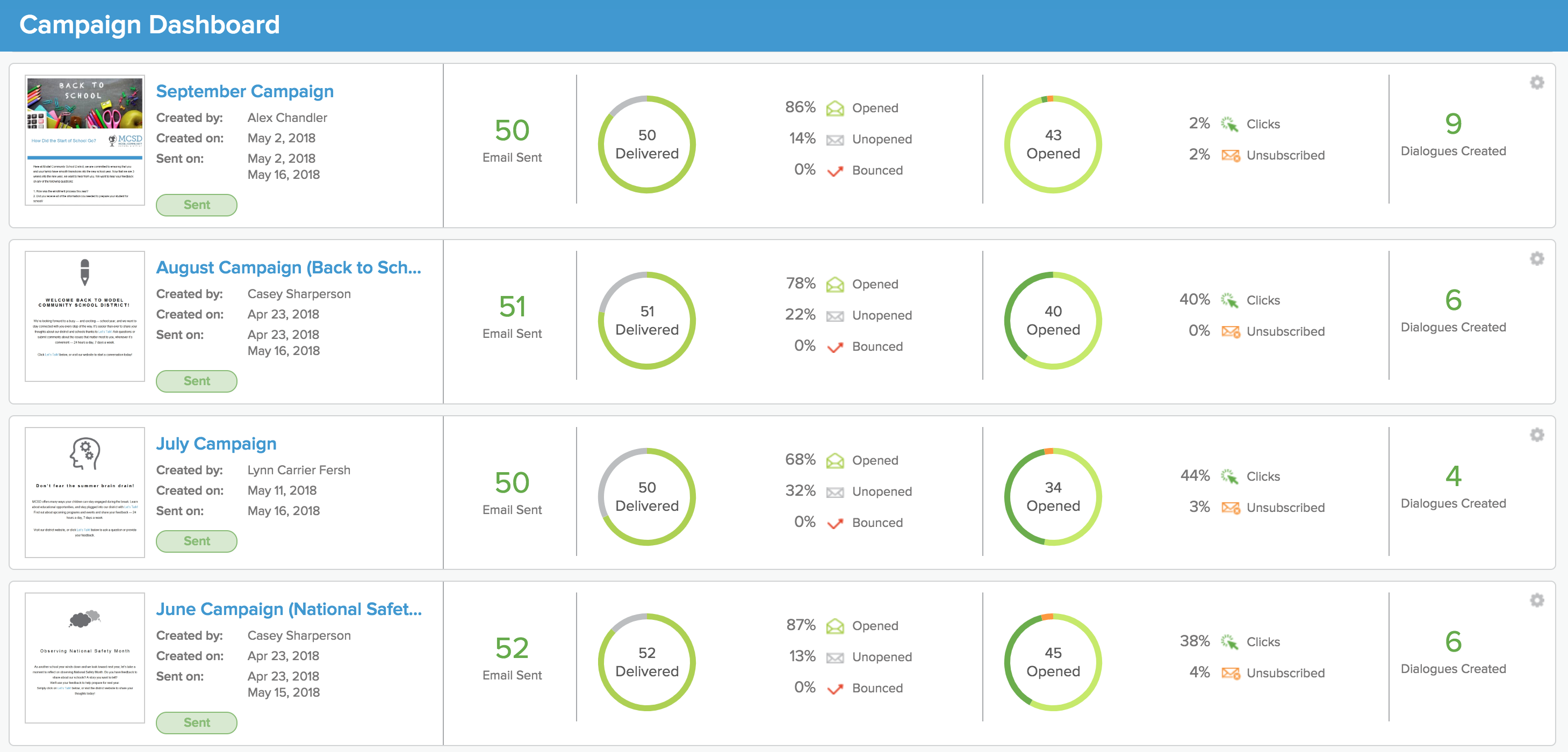 - Click the gear wheel to the right of each campaign to View Full Report, Download Report, Resend Campaign, or Delete Campaign.