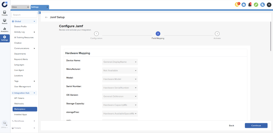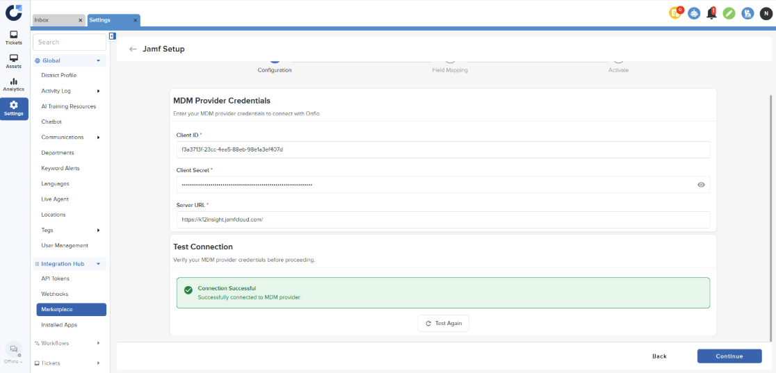 Step 2: Configure the MDM details and verify the connection. For instructions on setting up the Jamf details, please refer to this document. Once the connection is successful, click Continue.