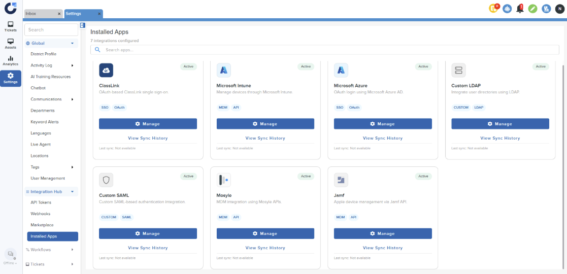 Step 5: Once the application is installed it will be shown in the Installed Apps section of the Integration Hub.