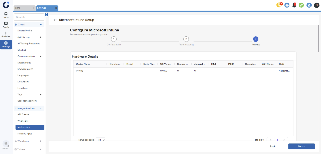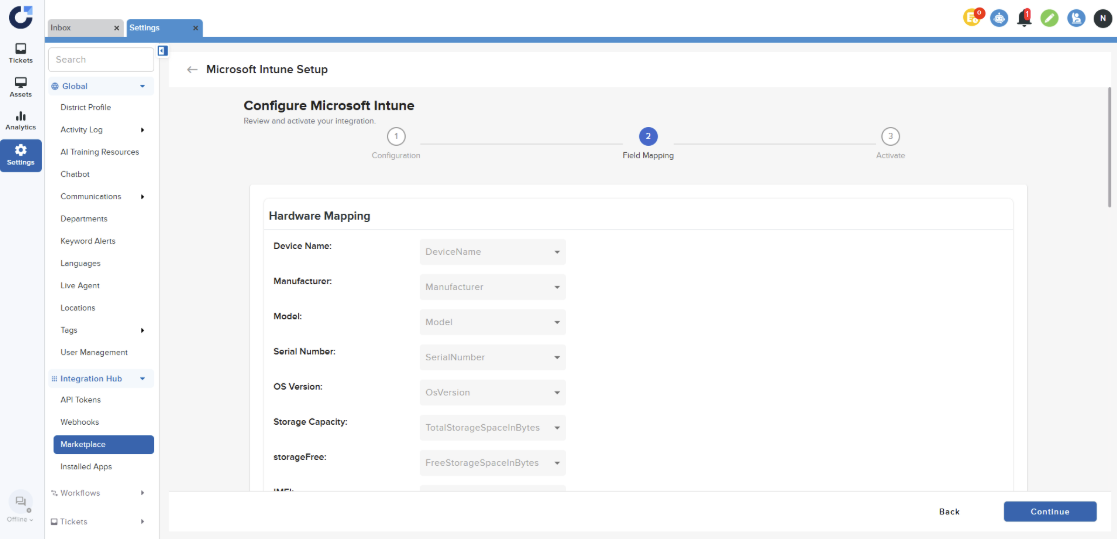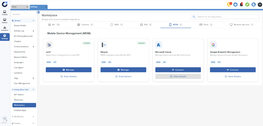 Step 1: Click Connect on the Microsoft Intune Application in the MDM section of the Integration Marketplace