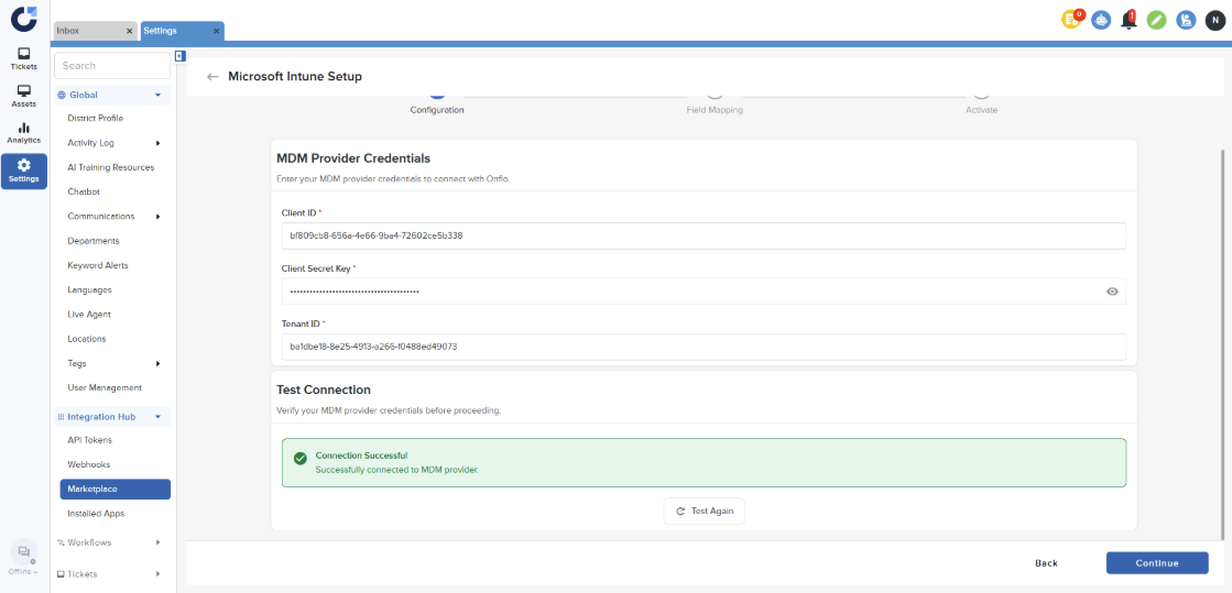 Step 2: Enter the MDM provider credentials. For instructions on obtaining these credentials, please refer to this article. Test the connection and click on Continue once the connection is successful.