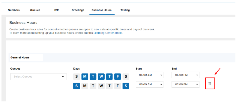 You can delete a Business Hour entry by simply clicking the trash can icon next to it. Don't forget to click on Save down below!