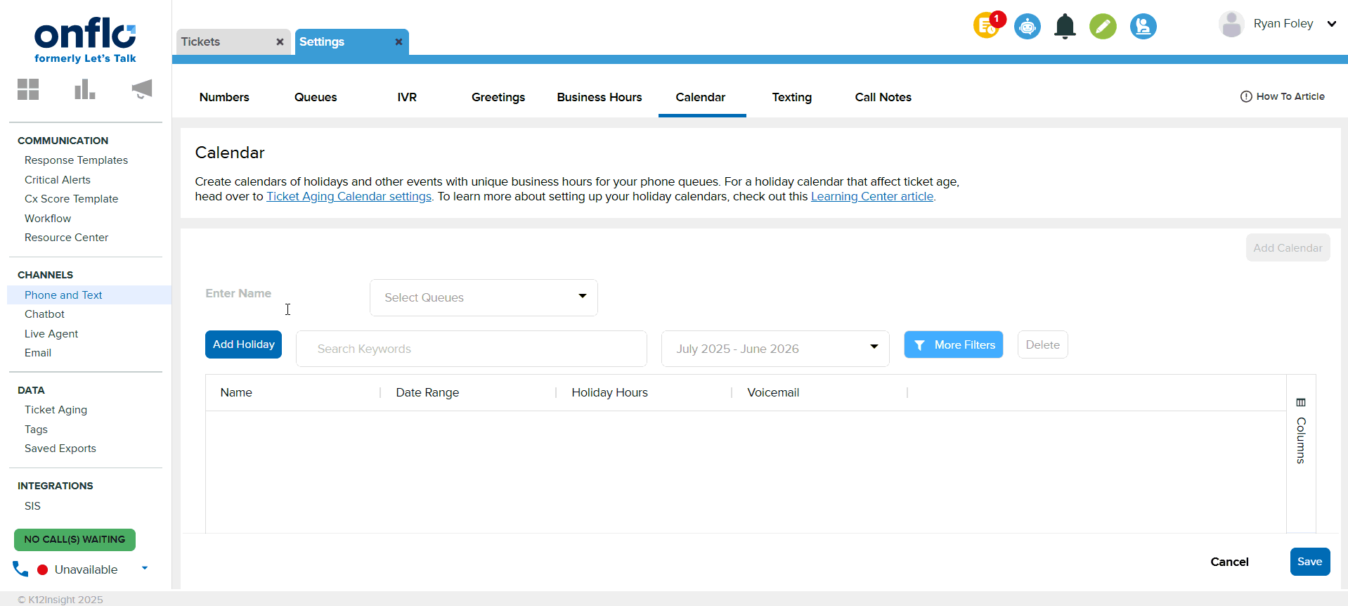 Note: These holiday calendars only control call center routing. For handling how tickets age, refer to the calendar within the ticket age settings.