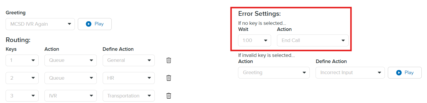 If any of these selections are made the corresponding drop down menu will update to Queue, IVR Menu, or Greeting for you to select which of the options from the category you selected that you would like the call routed to.