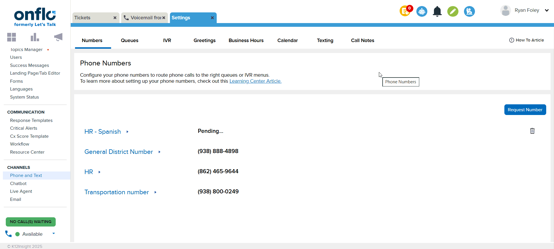 System Administrators have the capability to select which phone numbers are available to which queues and corresponding staff. For example, if you want Transportation staff members to only have access to the Transportation phone line, then you can limit the number to only be available for the Transportation queue agents.