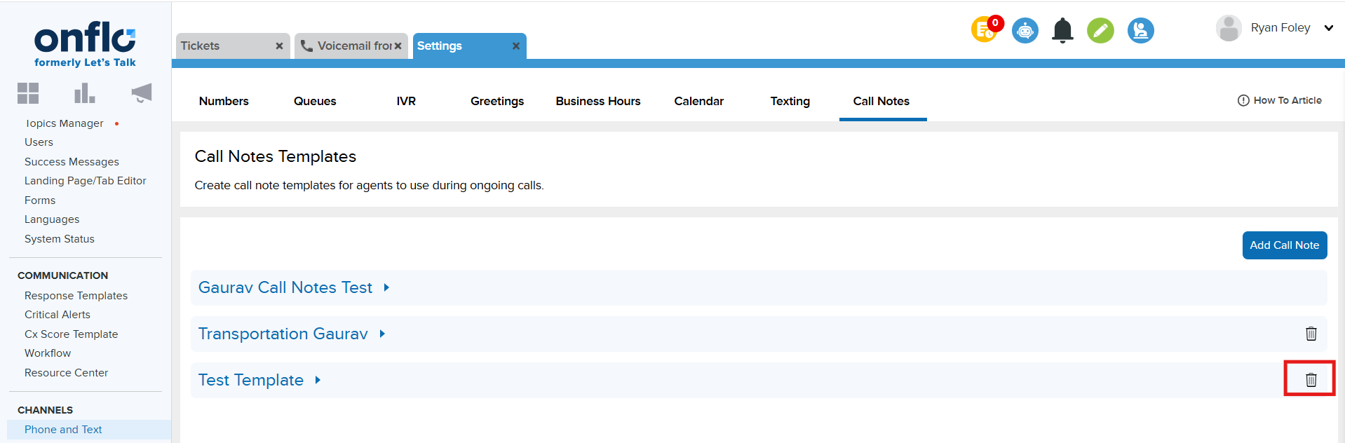 If you need to edit the template you can click on the title to access the template, and make any changes necessary. Additionally, you can delete a call note template you can click the small trash can icon on to the line of the template.