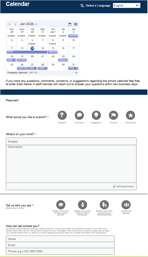 - Customer Type: One or more categories may be selected – Student, Employee, Parent/Guardian, or Community Member. Options may vary. Mandatory.
