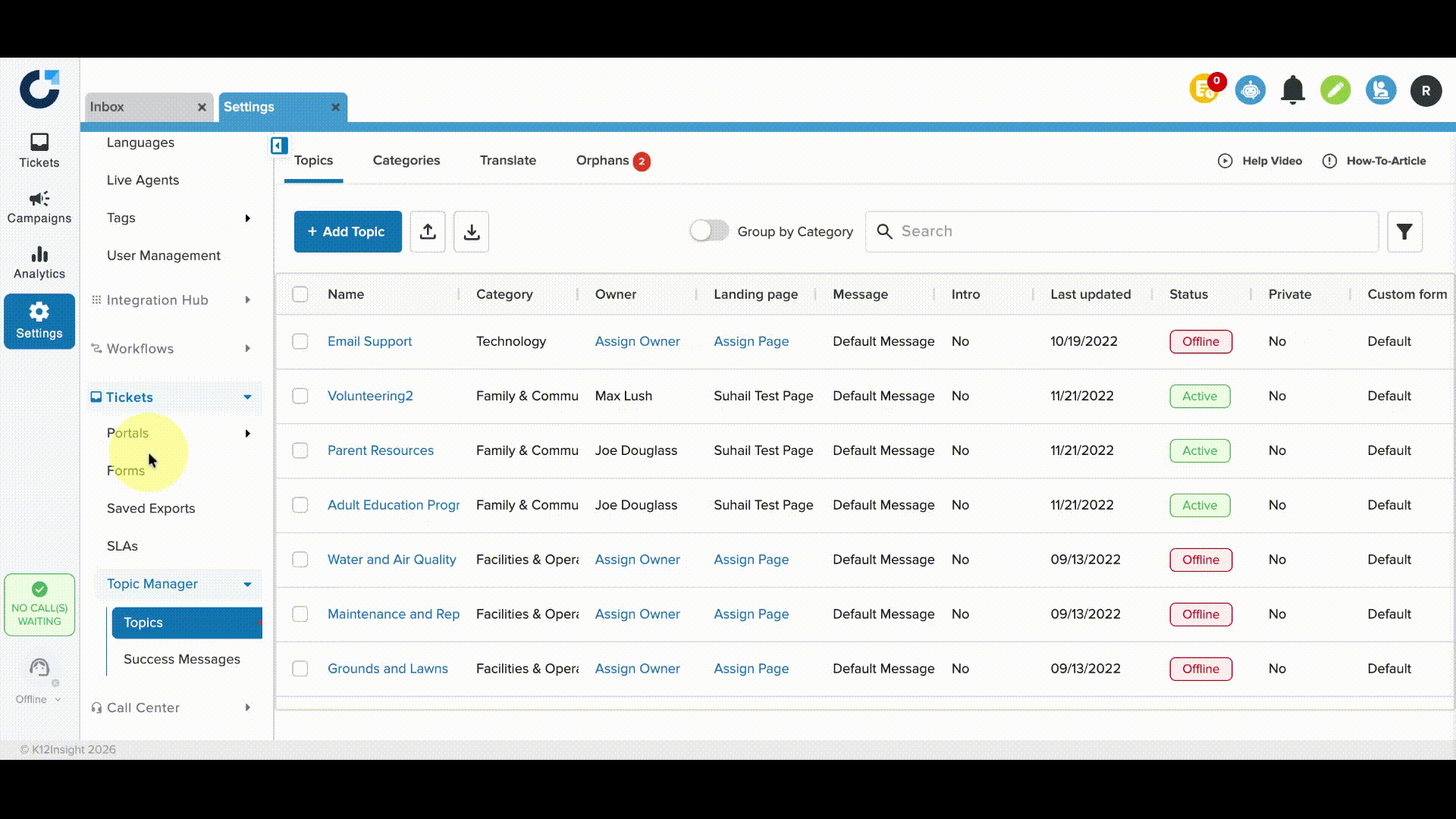 Navigate to the Topic Manager and select or search for the topic to be edited. Click on the topic name to open the editor. The name of the topic, owners, team members, category, landing page, and even the messaging a customer sees when they choose this topic can be edited. Click Save to save changes.