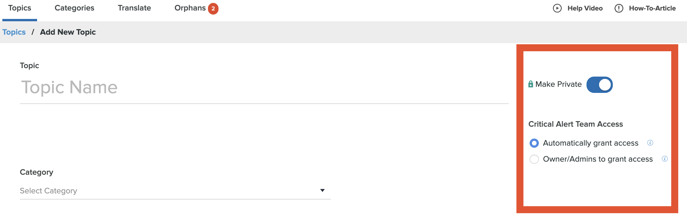 - Users can also make the category private by checking the Make Category Private box. Topics in Private Categories cannot be accessed by anyone other than the Category Administrator and the respective Topic Owners.