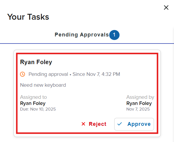 - End-User Task View: End users can easily view their assigned tasks and pending approvals by hovering over the icon in the top right-hand corner.