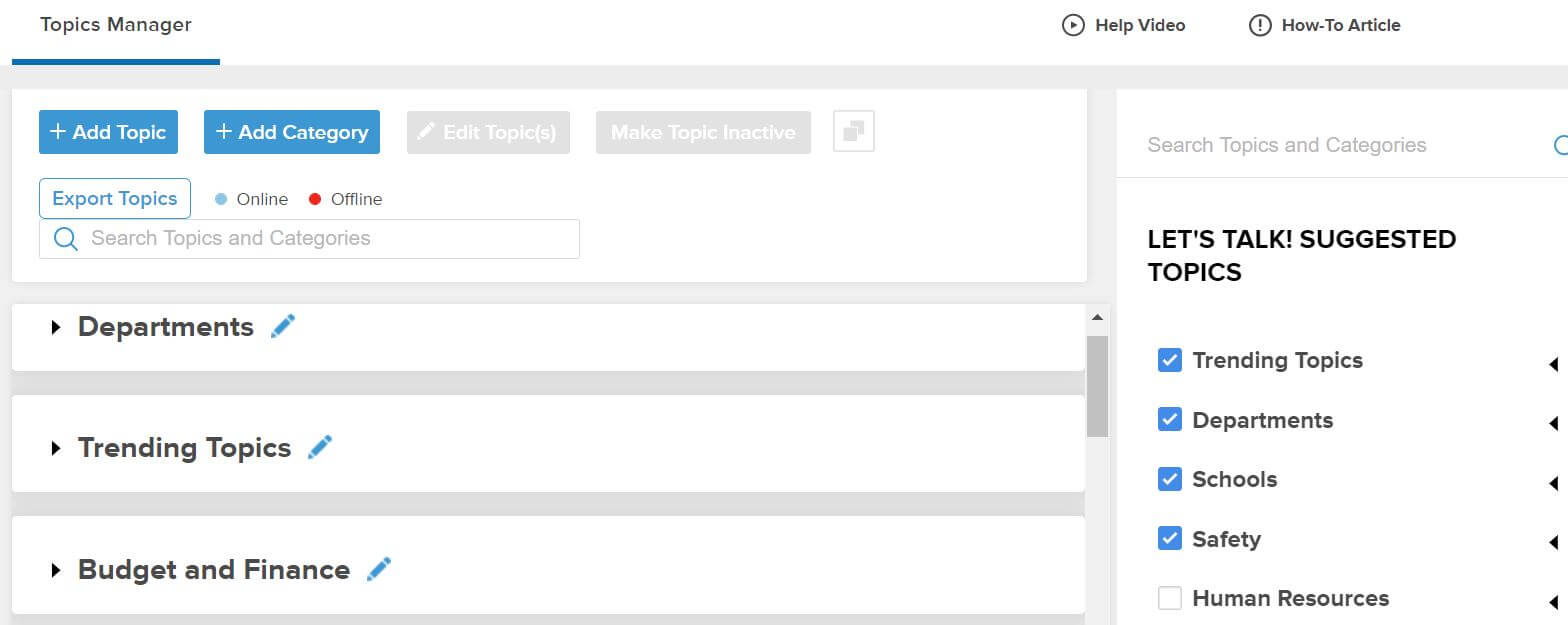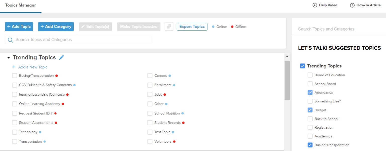 As you work within Topics Manager, you’ll now see suggestions for categories. Additionally, topics can be viewed for each category on the right within Onflo and once checked, they appear on the left.