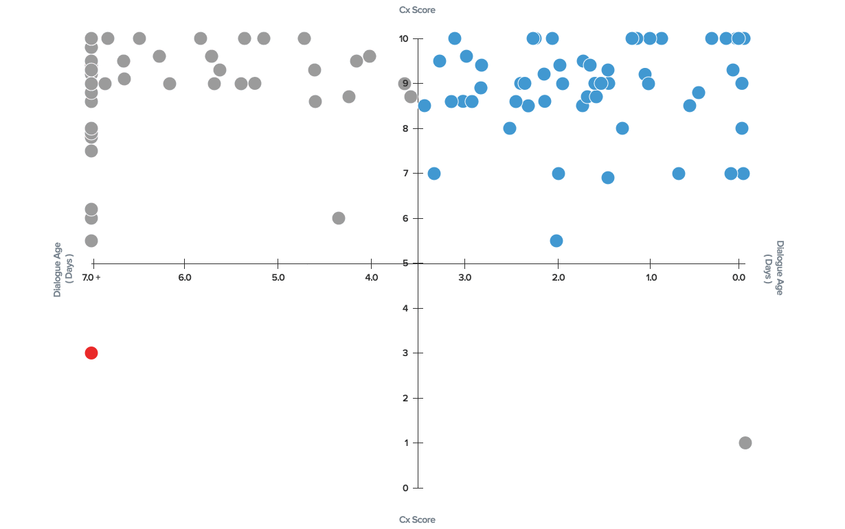 Users, Interest Areas or Interest Area Categories are placed on a grid-based on their average Ticket Age and Average CX Score to visually showcase and compare the state of progress each team, user or category falls under.
