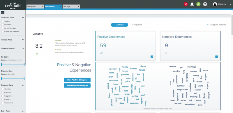 - Dashboard filters are now pulled to the side of the screen for easy access and filter layering (I want to see data for only this Interest Area that received a CX score of 7 or below).